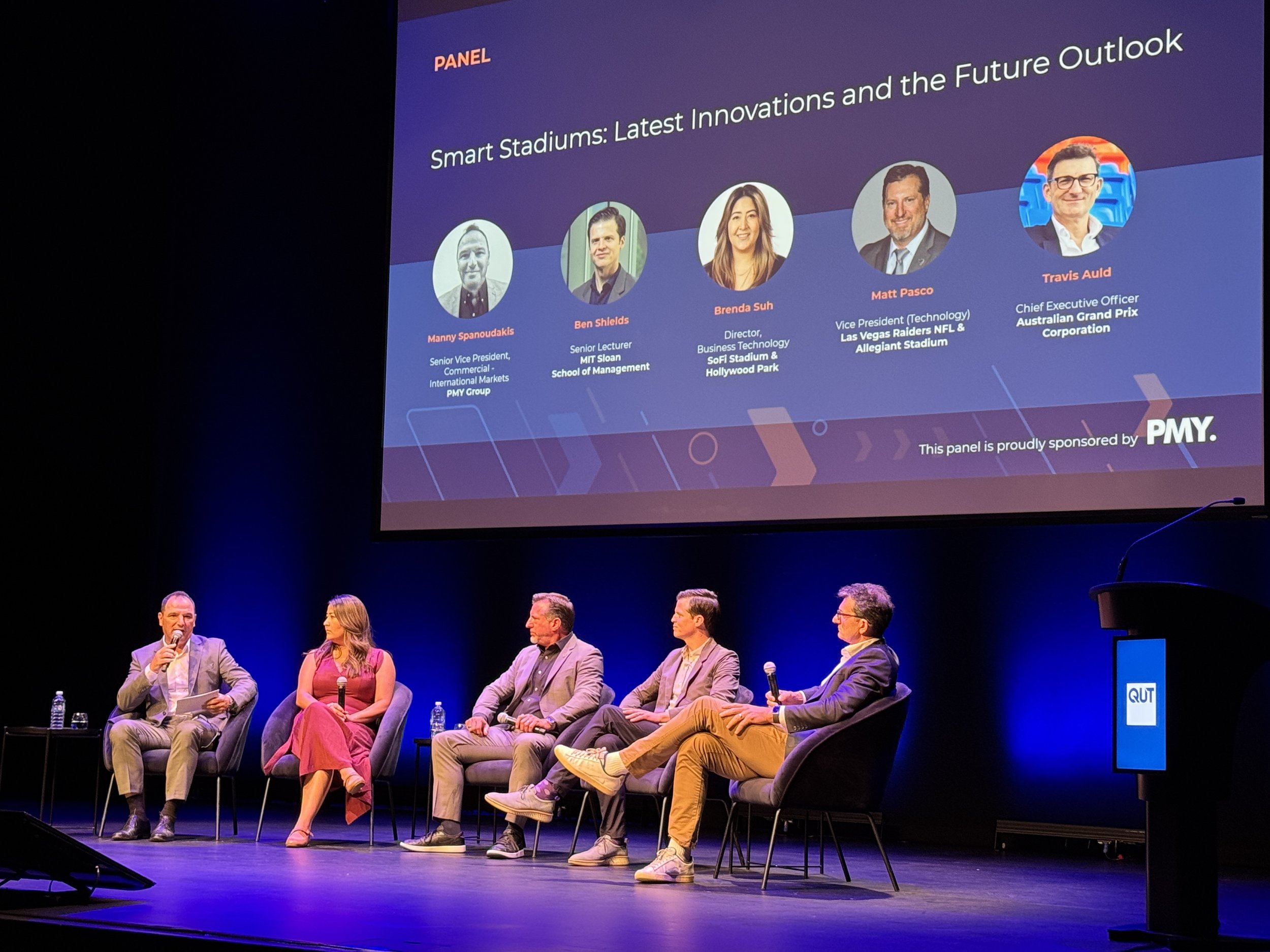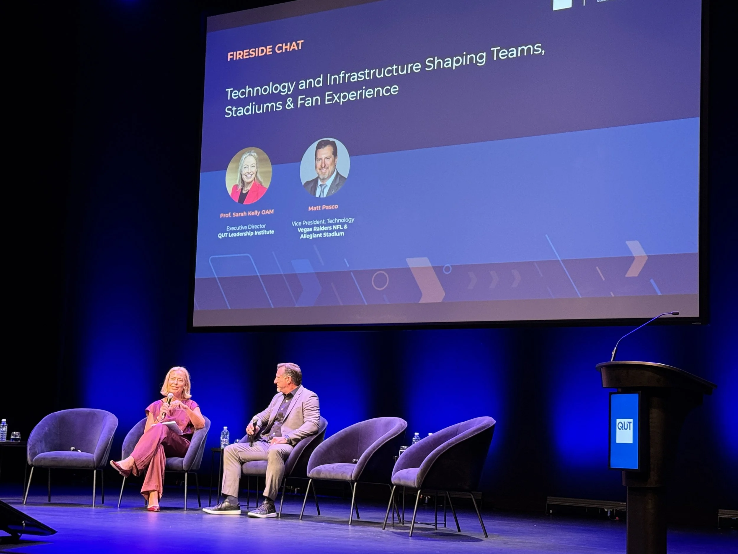QUT’s Prof. Sarah Kelly OAM hosting a fireside chat with Matt Pascoe VP of Information Technology at Las Vegas Raiders and Allegiant Stadium